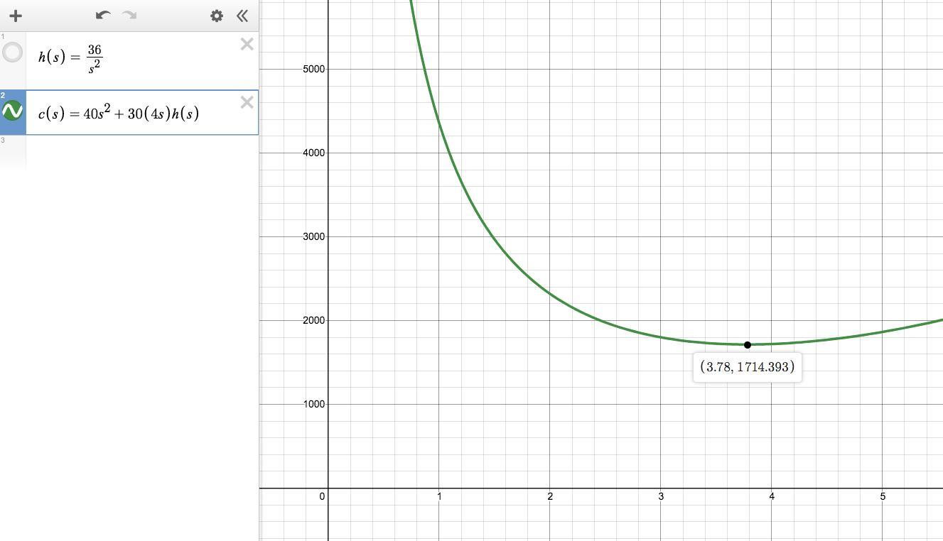 /m2 and the cost of the sides is $30/m2 . Find the dimensions of the box that minimize total cost. (Let s denote the length of the side of the square bottom of the box and h denote the height of the box.)