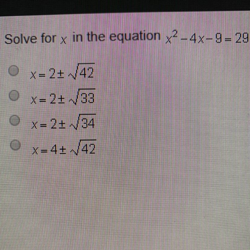 Solve for x in the equation X2-4x-9 = 29 X = 2+ 42 X = 2+ V33 X= 2+ 34 X=442