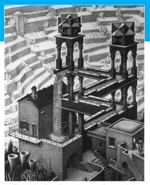 I found the famous Escher drawing. It is a drawing of a waterfall. However, it is physically wrong because it shows that the water from the falls goes up after it falls down and the cycle continues.