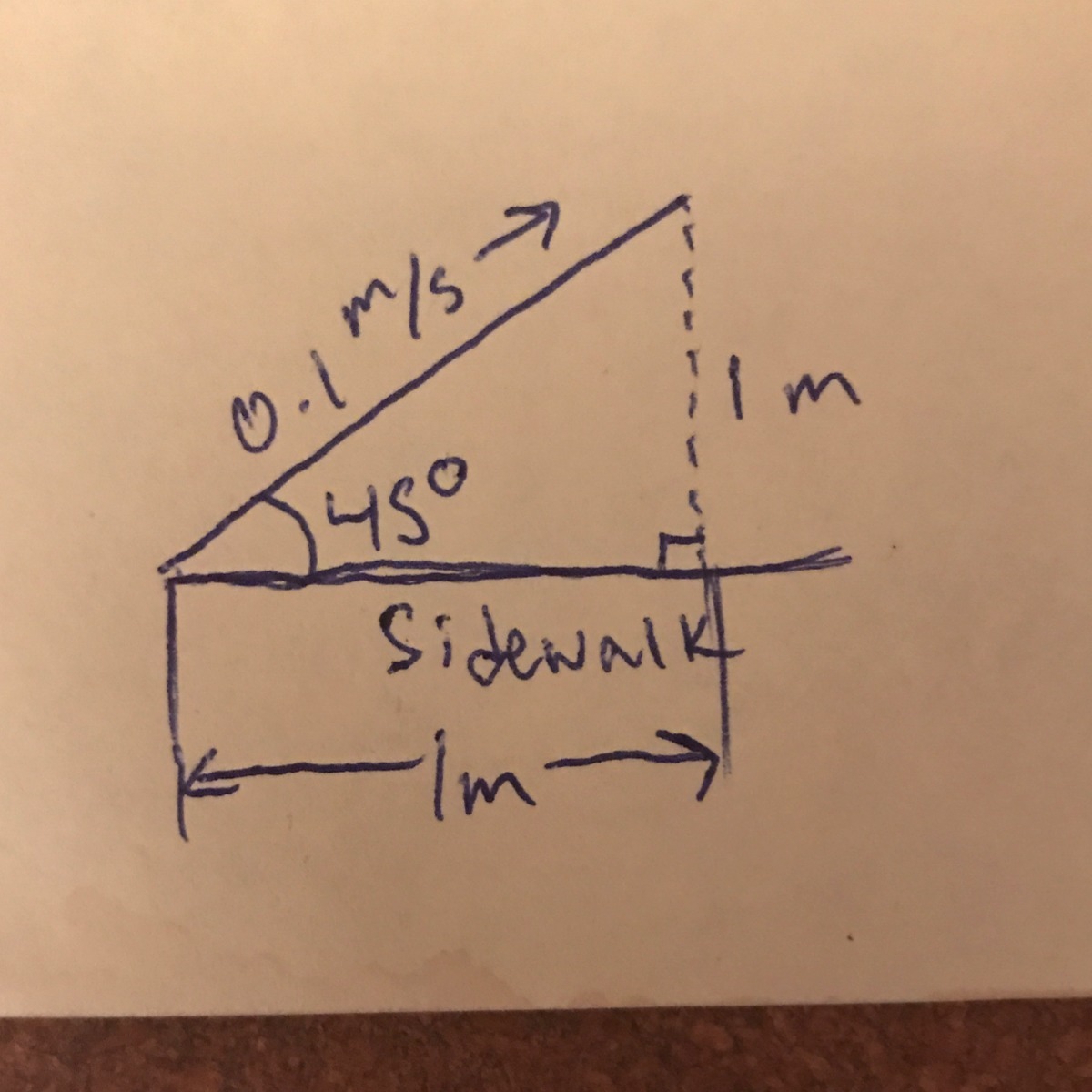 We know the any traveled 1 m away from the sidewalk, and since we have a 45-45-90 triangle we know that the horizontal distance traveled is also 1 m. Use a^2+ b^2 = c^2 to find the distance the ant traveled. We get sqrt(2).