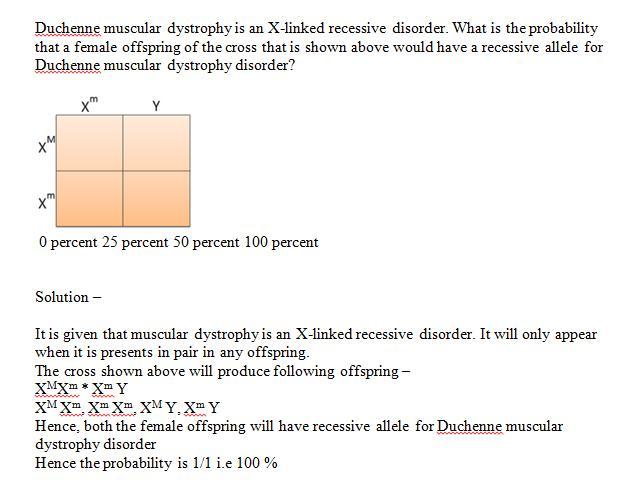 is shown above would have a recessive allele for Duchenne muscular dystrophy disorder? 0 percent 25 percent 50 percent 100 percent