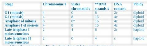 So, we put our answer (which is the attached image) in a tabular form to indicate the number of chromosomes, the number of sister chromatids, the number of DNA strands, and the DNA (or genome) content (as the factor of c) and ploidy (halploid (n) or diploid (2n)) for each stage of the cell cycle