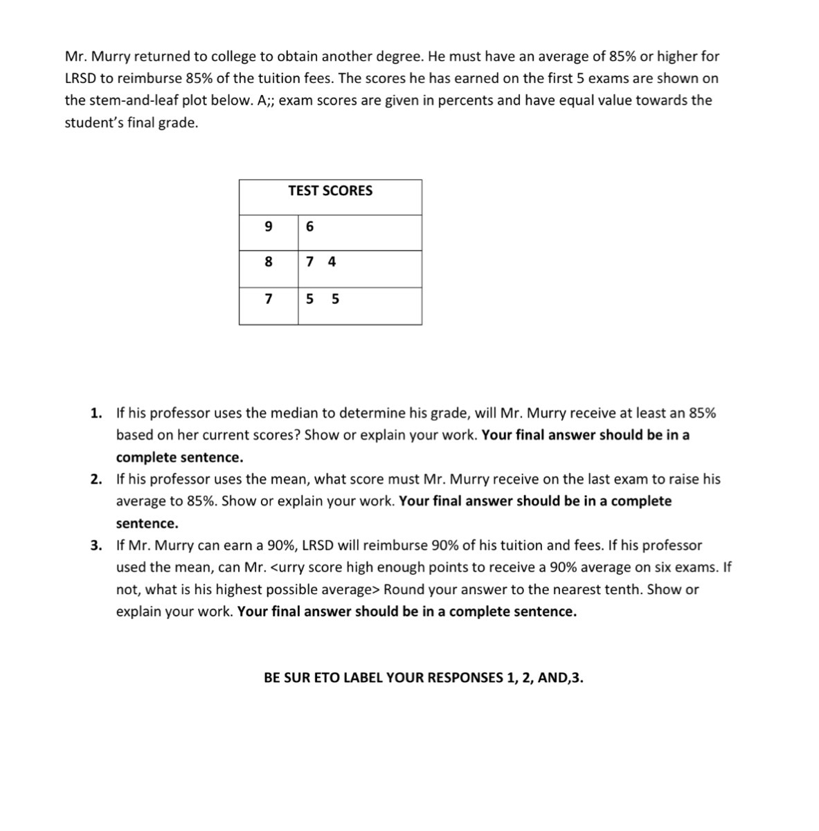 The last answer would be set up like 75+75+84+87+96+90 ------------------------------- = (the mean) 6 That is 84.5. That means that he wont be reimbursed. His average is 84.5.