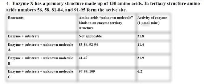 Enzyme X has a primary structure made up of 130 amino acids. In tertiary structure amino acids numbers 56, 58, 81-84, and 91-95 form the active site.