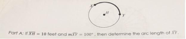 Find out the length of the arc xy if the central angle is equal to 100 degrees