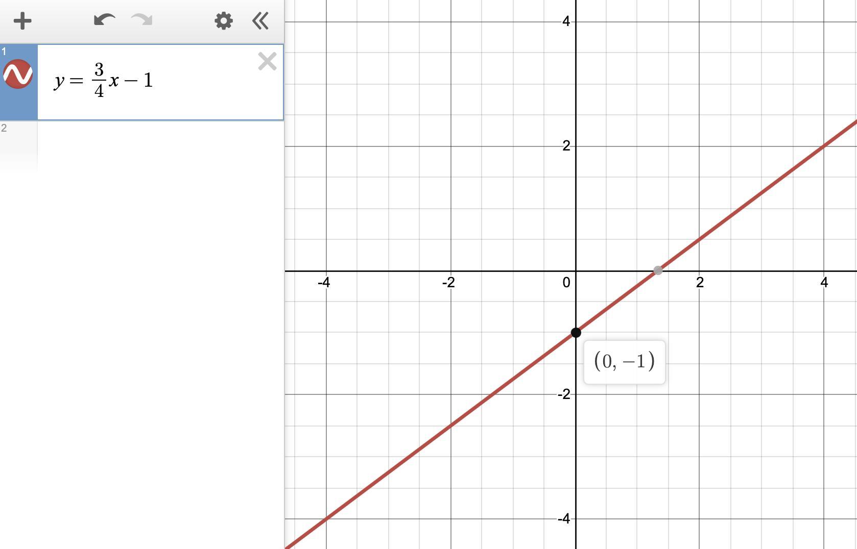 The slope is 3/4. The line intersects (0, -1). The y-intercept is -1.