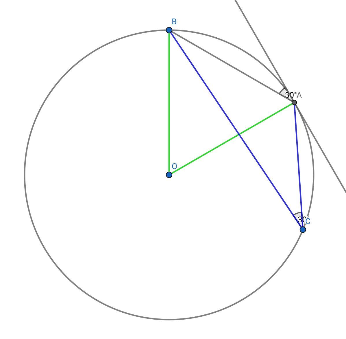 Angle OAB is the internal angle of that triangle, so is 60°. Since OA is perpendicular to the tangent line (makes an angle of 90°), The angle between the tangent line and the chord must be ...