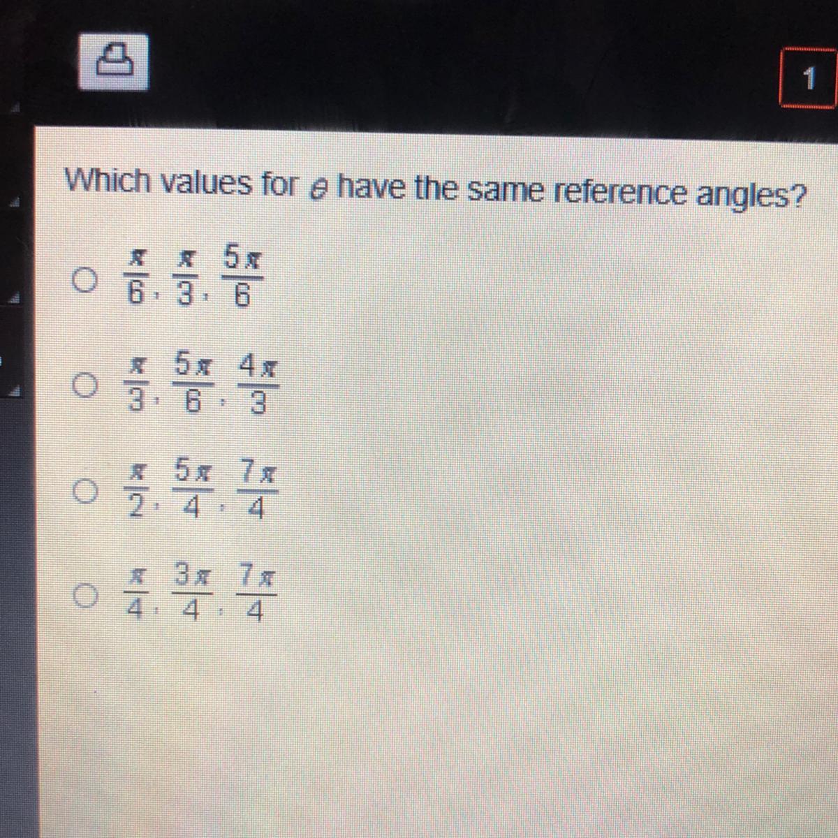 Choice 4: π/4, 3π4, 7π/4 - correct. All of these radians contain the same denominator, and will each have the same reference angles of π/4.