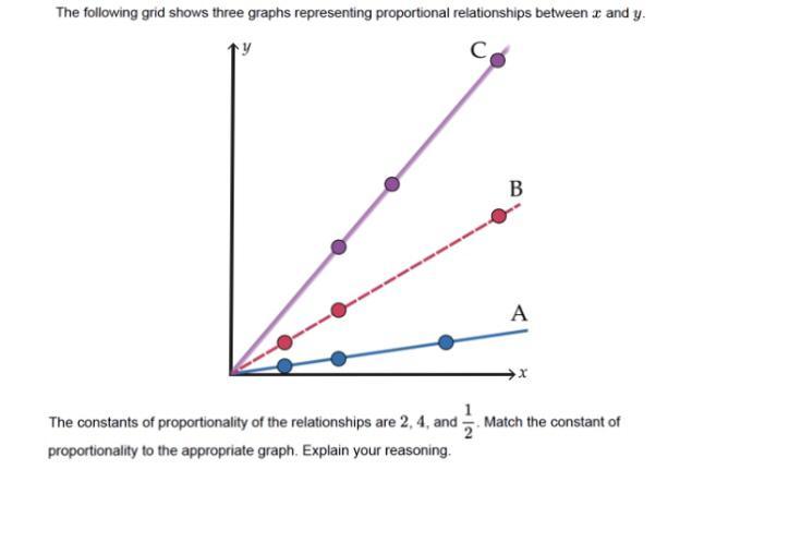 The purple line is the steepest line, therefore it has the biggest constant of proportionality or slope. Since 4 is the biggest number among the others, we attribute it to the purple line (the one with the point C on it).
