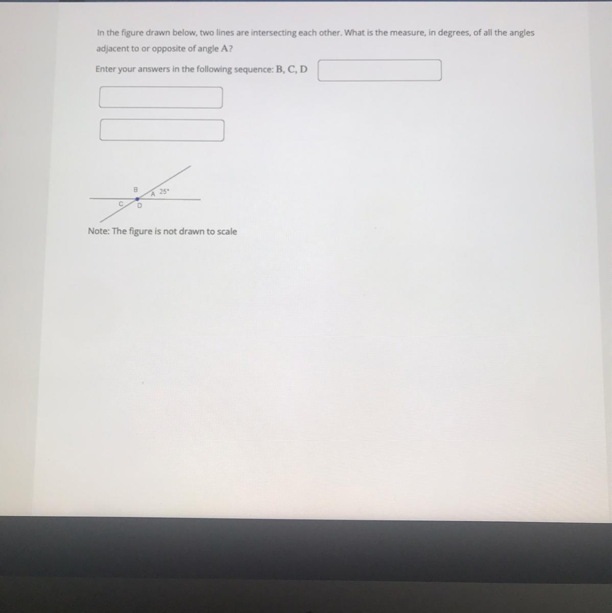 We know that C = A because they're vertical angles, so A = C = 25 degrees.
