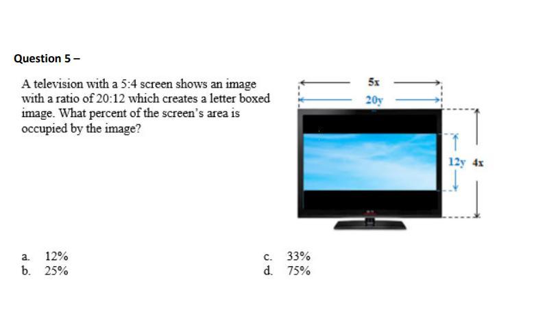 <h3>A television with a 5:4 screen shows an image with a ratio of 20:12 which creates a letter boxed image. What percent of the screen's area is occupied by the image?</h3>