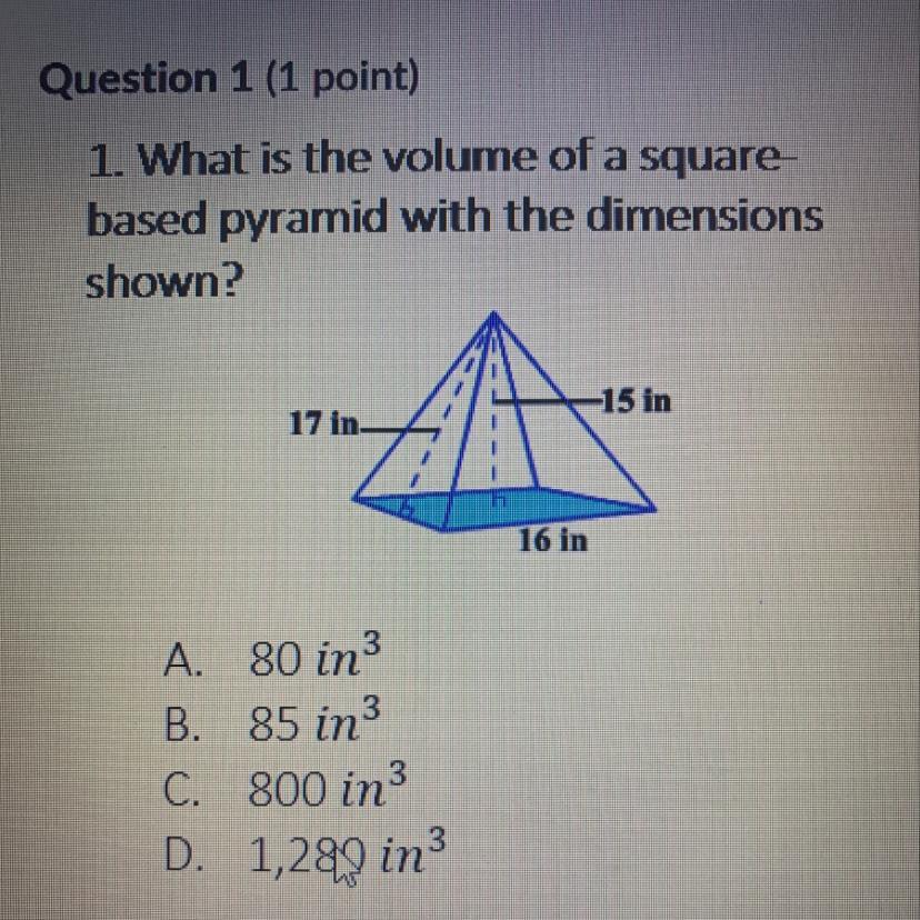 As the given pyramid is a square based pyramid, therefore the formula to find the volume for square based pyramid is,