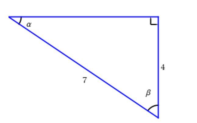 Now, in this question, the opposite side to α is 4 and the hypotenuse is 7. Thus, sin(α) = 4/7