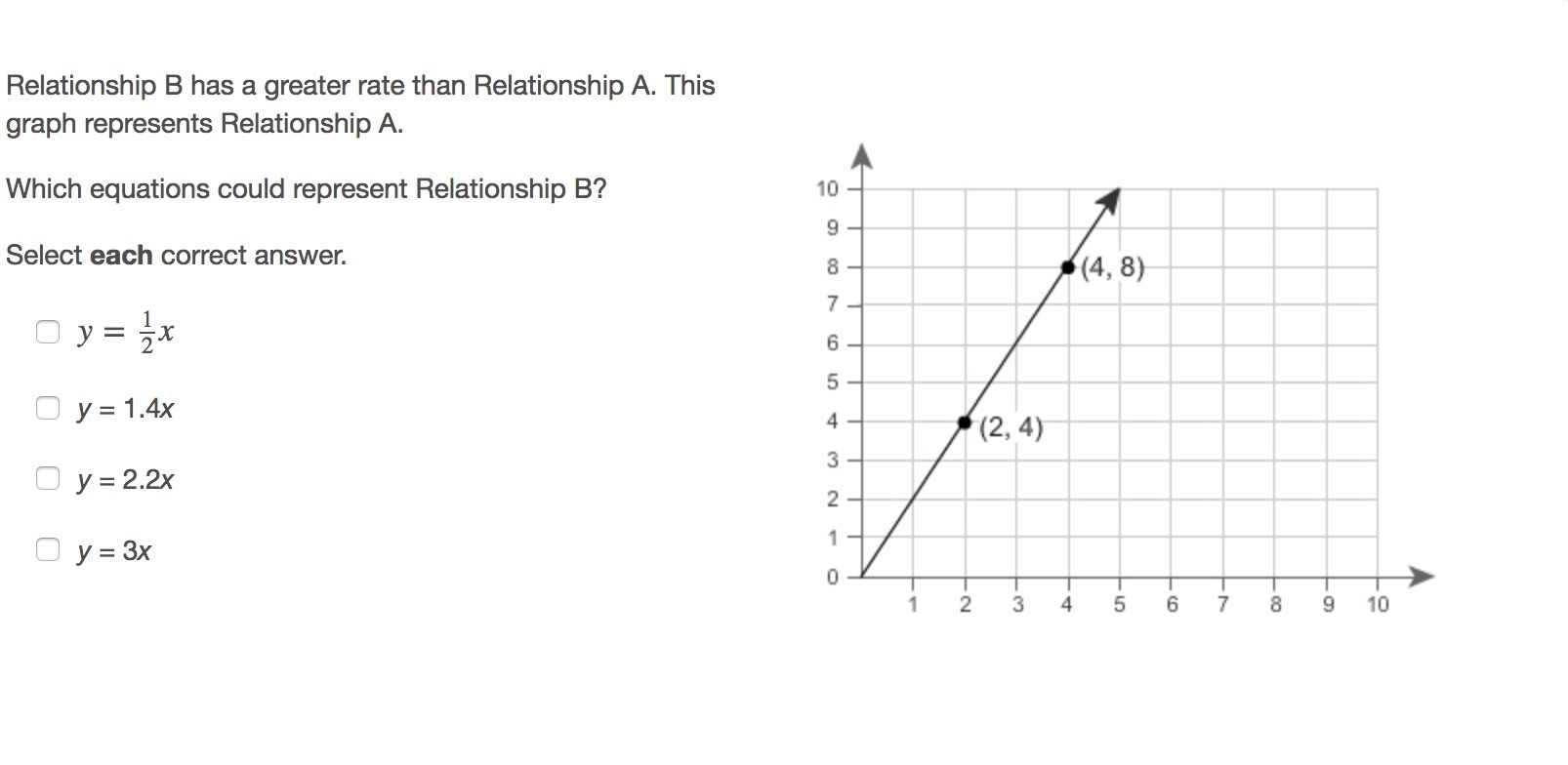Y=2.2x and y=3x because their slopes are greater than y=2x