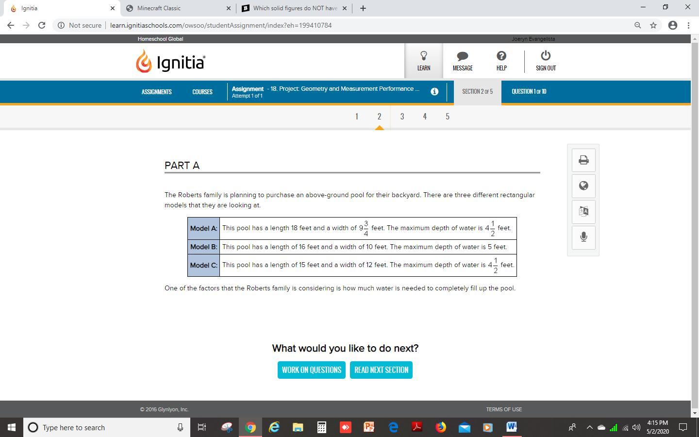 First, lets start by getting all of the perimeters and volumes of the pools. For pool A, it has a volume of 18*9.75*4.5=789.75 cubic feet, and a perimeter of 18*2+9.75*2=55.5 feet. For pool B, it has a volume of 16*10*5=800 cubic feet, and a perimeter of 16*2+10*2=52 feet. For pool C, it has a volume of 15*12*4.5=810 cubic feet, and a perimeter of 15*2+12*2=54 feet. Therefore, for problems 1 and 2, Model C needs the largest amount of water to be filled, while model A needs the least. For problems 3 and 4, Model A uses the largest liner, while Model B uses the smallest one. Hope this helps!