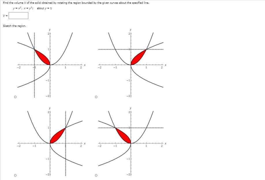 ![V\:=\:\pi \int _0^1\:\left[\left(1-x^2\right)^2-\left(1-x^{\frac{1}{2}}\right)^2\right]dx,\\=> \pi (\frac{1}{5}-\frac{2}{3}-\frac{1}{2}+\frac{4}{3})\\\\=> \pi \frac{11}{30}\\\\=>\frac{11\pi }{30}](https://tex.z-dn.net/?f=V%5C%3A%3D%5C%3A%5Cpi%20%5Cint%20_0%5E1%5C%3A%5Cleft%5B%5Cleft%281-x%5E2%5Cright%29%5E2-%5Cleft%281-x%5E%7B%5Cfrac%7B1%7D%7B2%7D%7D%5Cright%29%5E2%5Cright%5Ddx%2C%5C%5C%3D%3E%20%5Cpi%20%28%5Cfrac%7B1%7D%7B5%7D-%5Cfrac%7B2%7D%7B3%7D-%5Cfrac%7B1%7D%7B2%7D%2B%5Cfrac%7B4%7D%7B3%7D%29%5C%5C%5C%5C%3D%3E%20%5Cpi%20%5Cfrac%7B11%7D%7B30%7D%5C%5C%5C%5C%3D%3E%5Cfrac%7B11%5Cpi%20%7D%7B30%7D)