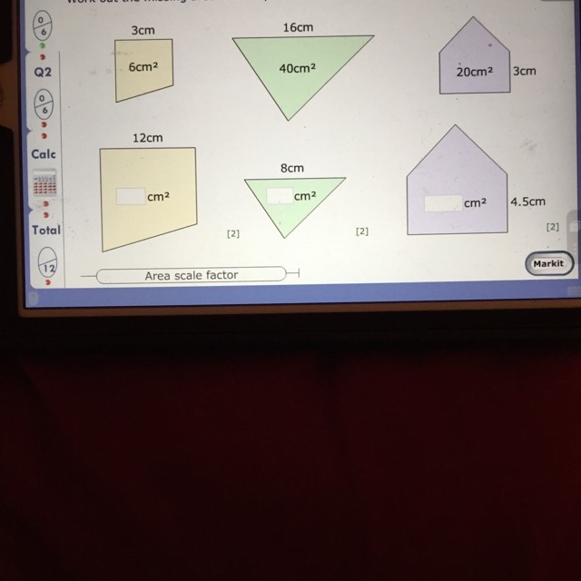 The first shape seems to be scaling up. From 3cm to 12cm. So for this you need to multiply. Using the formula that I gave you last time. 3cm times ___ = 12cm. 4 fits in there, therefore 6cm^2 times 4 = 24cm^2.