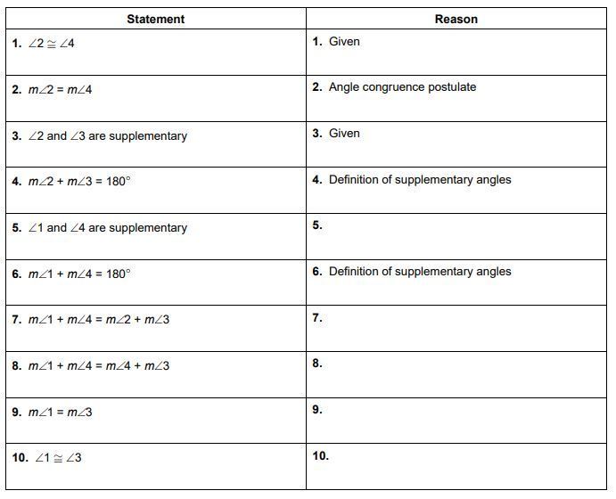This proof involves the definitions of congruence and supplementary angles, as well as some of the properties of equality.
