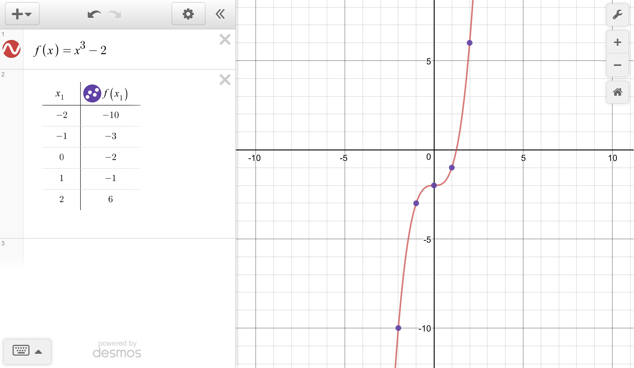 A cubic with a positive x³ coefficient will have a generally "/" shape, increasing to the right. When your function is evaluated at x=-2, you get (-2)³-2 = -8-2 = -10. These facts are sufficient to help you select the 3rd choice as being appropriate.