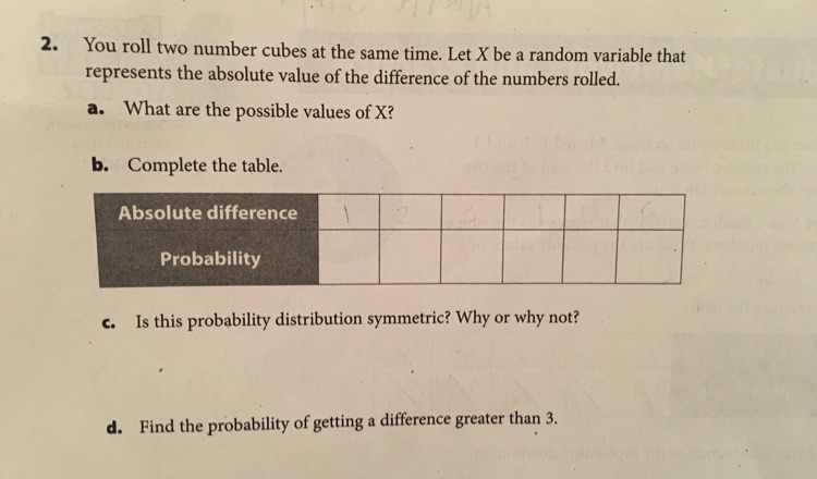 MATH PROBLEM!! CAN SOMEONE HELP 25pts You roll two number cubes at the same time. Let X be a random variable that represents the