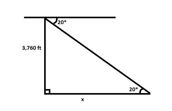Upon looking at the attached image, we can see that plane forms an right triangle with respect to ground, where angle of depression is 20 degrees.