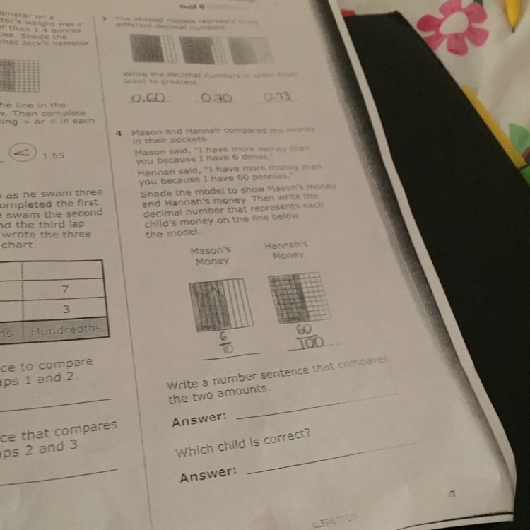 Ok Part B: Both of the children are incorrect. The children have the same amount of money Explanation: they have the same amount because 6 dimes are 60 cents... Hannah says she has 60 cents while Mason says he has 6 dimes. Got it? Part A: 6 dimes = 60 cents Explanation: None