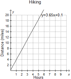 The graph shows the best-fit regression model for a set of data comparing the number of hours spent hiking and the number of mil