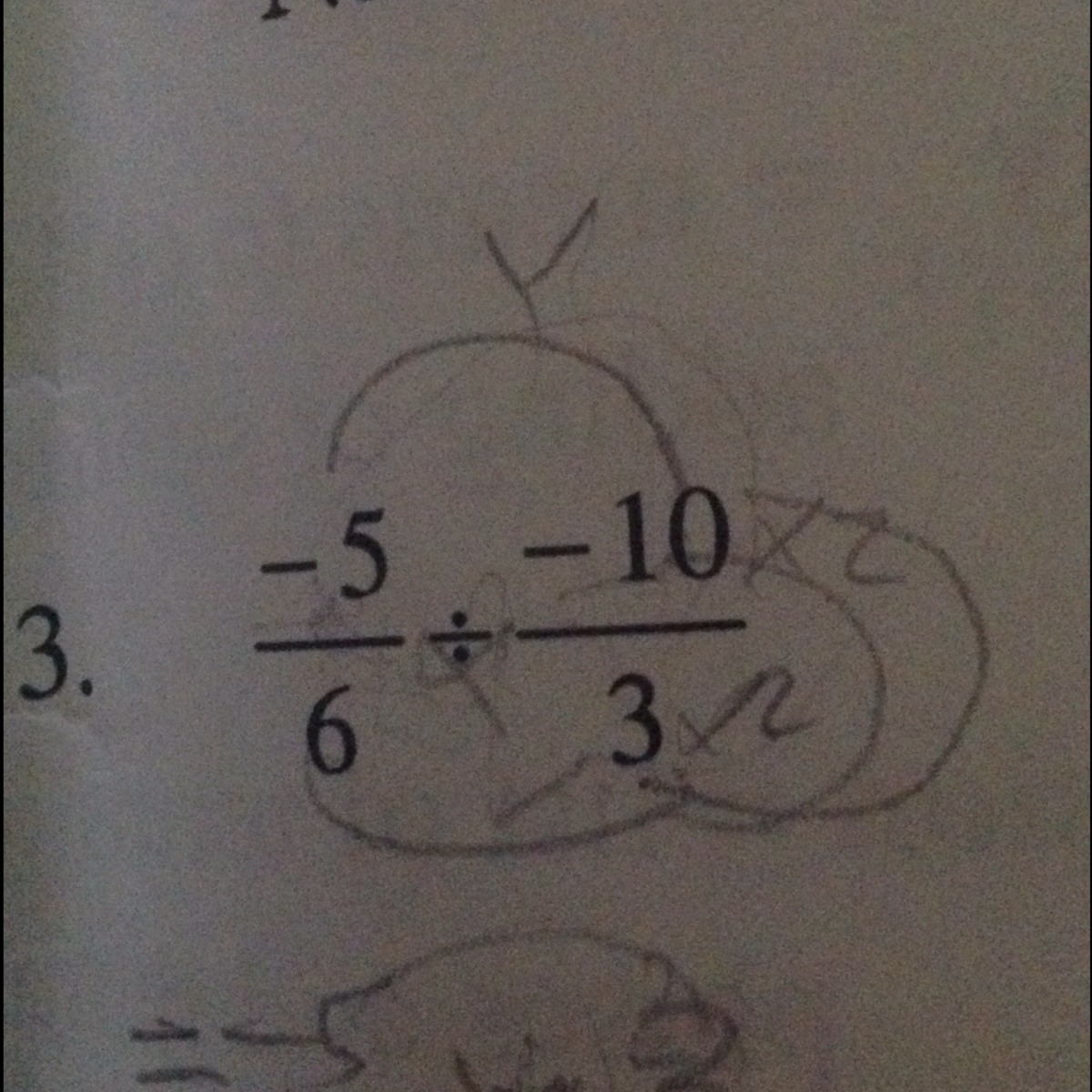In order to divide two fractions, you would flip the second fraction and multiply then together. So, -5/6 times -10/3 is actually -5/6 times -3/10.