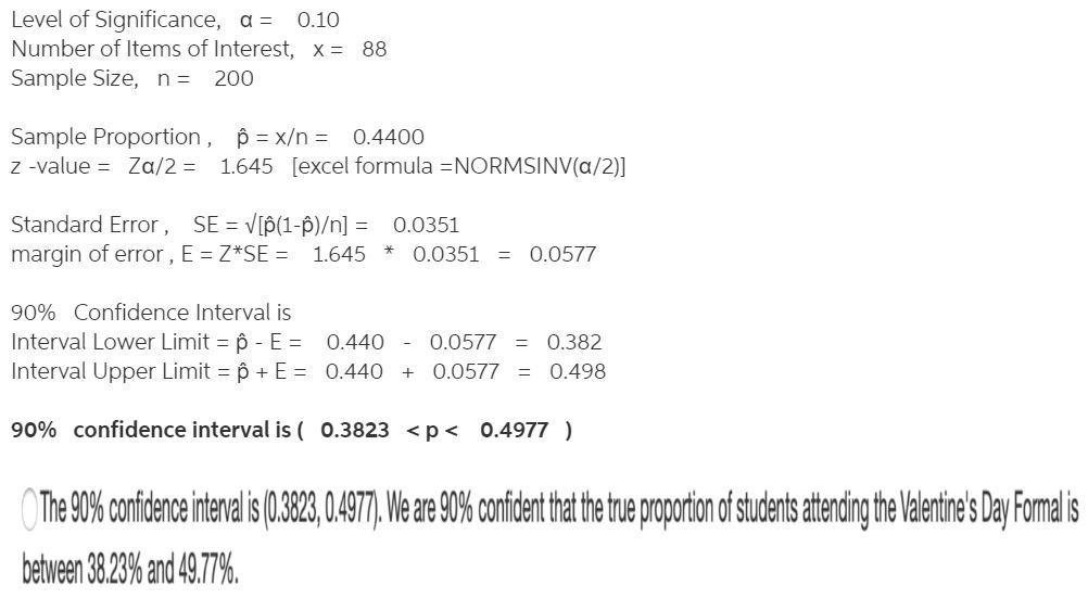 The 90% confidence interval is (0.3823, 0.4977). We are 90% confident that the true proportion of students attending the Valentine's Day Formal is between 38.23% and 49.77%.