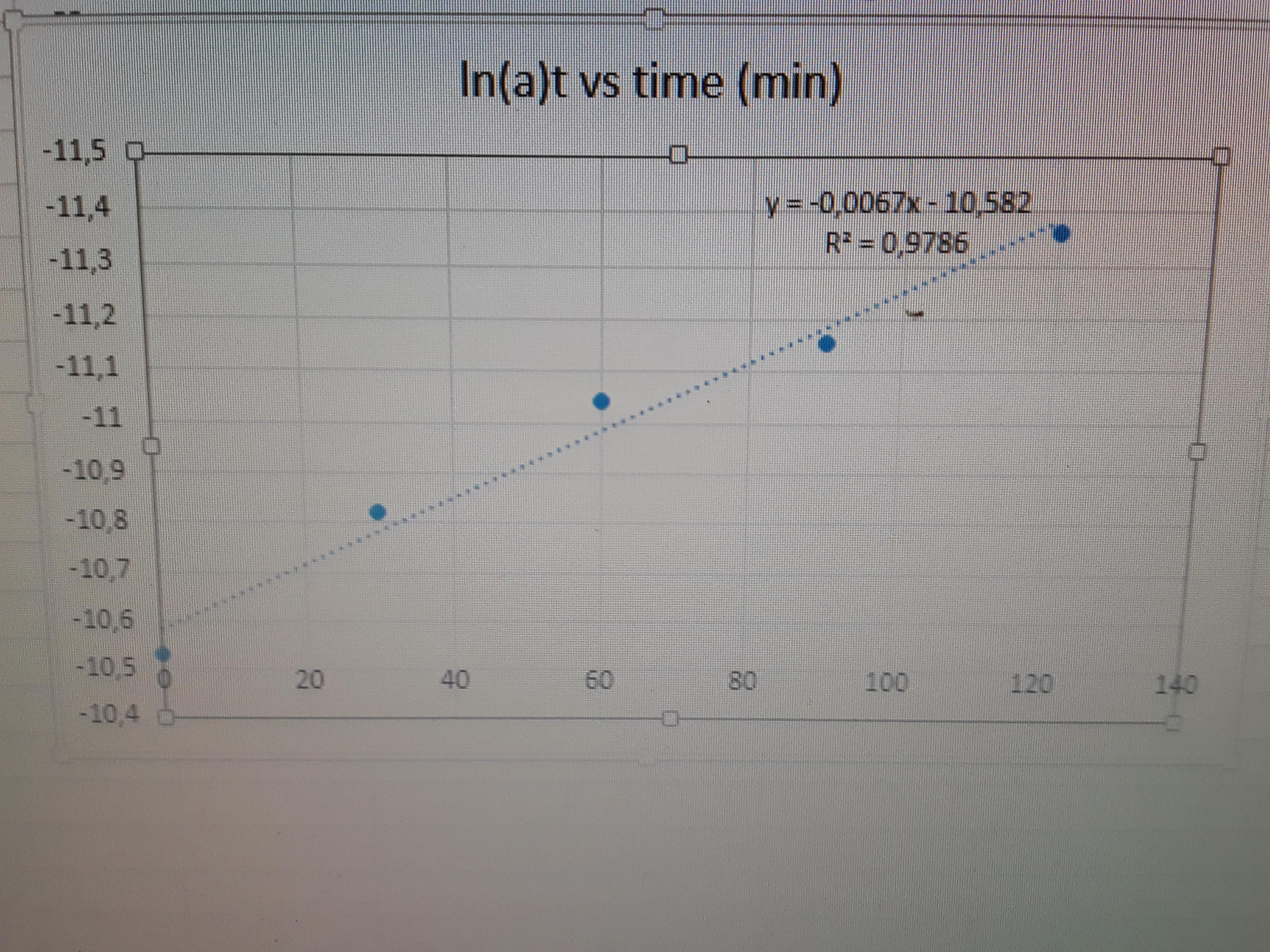 To verify if our reaction is first order, we will graph the graph the data and see if it is a straght line and and if it is compute the slope which is k.