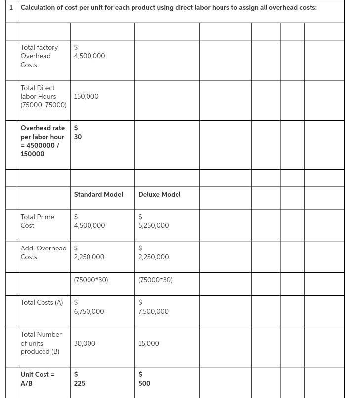 dard model and a deluxe model. The deluxe model has a wider and sturdier base and a variety of electronic gadgets to help the exerciser monitor heartbeat, calories burned, distance traveled, etc. At the beginning of the year, the following data were prepared for this plant: Standard Model Deluxe Model Expected quantity 30,000 15,000 Selling price $370 $700 Prime costs $4.5 million $5.25 million Machine hours 37,500 37,500 Direct labor hours 75,000 75,000 Engineering support (hours) 13,500 31,500 Receiving (orders processed) 3,000 4,500 Materials handling (number of moves) 15,000 45,000 Purchasing (number of requisitions) 750 1,500 Maintenance (hours used) 6,000 24,000 Paying suppliers (invoices processed) 3,750 3,750 Setting up batches (number of setups) 60 540 Additionally, the following overhead activity costs are reported: Maintenance $600,000 Engineering support 900,000 Materials handling 1,200,000 Setups 750,000 Purchasing 450,000 Receiving 300,000 Paying suppliers 300,000 $4,500,000. Calculate the cost per unit for each product using direct labor hours to assign all overhead costs.