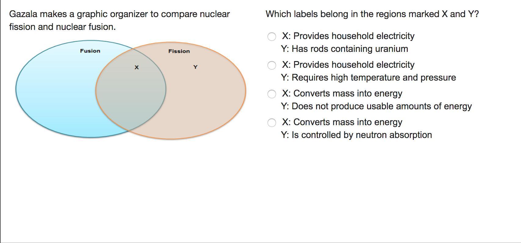 Gazala makes a graphic organizer to compare nuclear fission and nuclear fusion.