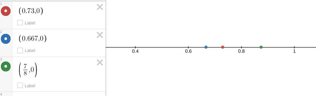 The first two numbers, 0.73 and 0.667, are near the point that is halfway between 0.6 and 0.8. That halfway point is 0.7. The value 0.667 will be below (left) of the halfway point, so is point <em>a</em>. The value 0.73 will be above (right) of the halfway point, so is point <em>b</em>. The remaining value, 7/8, must be point <em>c</em>.