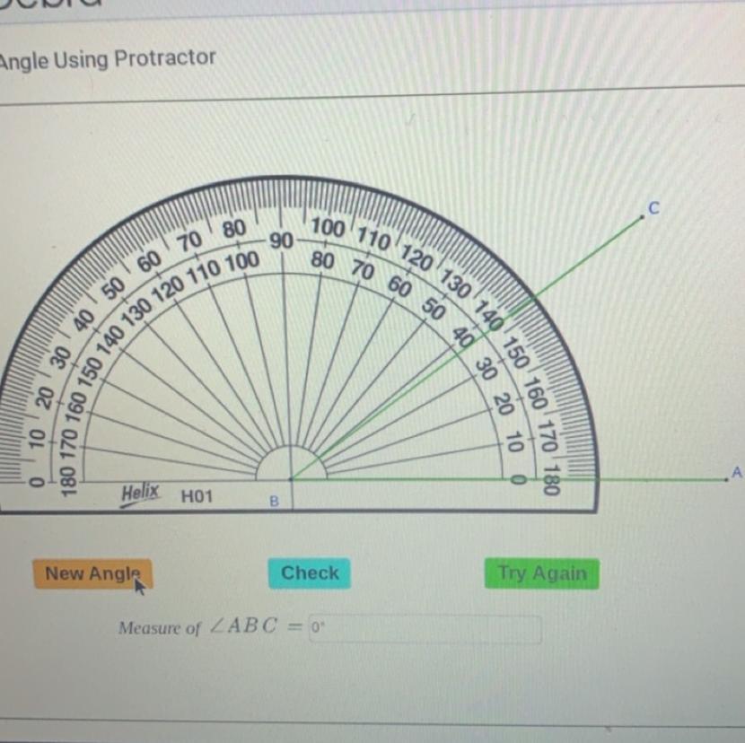 In the middle of the protractor is a little dot that you put on the common endpoint of the angle. You then line up “0” on the protractor to the first ray and line it up as accurately as possible. you will see your answer on the side of the protractor.