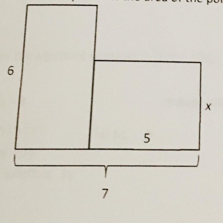 So, this "polygon" is really just two rectangles combined! With that in mind, remember that the area of a rectangle is base*height. Now, apply that to the problem. We know that the total length of the bottom base is 7, and 5 is the length of the second rectangle's base, so the 1st rectangle's base must be 7 - 5 = 2. The area of the 1st rectangle is then 6*2 = 12. The second rectangle's area is 5*x. So, if the area of the polygon is the sum of the two rectangles' areas, the expression you could use is: