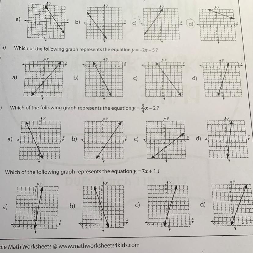 4)C y intercept of -2, slope is 3/4 rise over run which means we go up 3 and right 4 (right sense slope is positive)