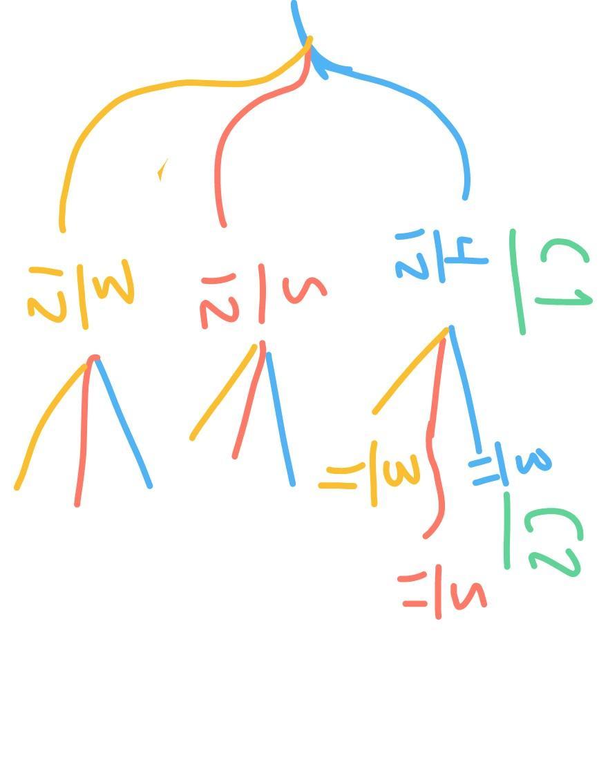 problem best done with a tree diagram. let's focus on the blue branch for child 1. the probability of child 1 getting a blue marble is 4/12. now since he's choosing randomly and we assuming that after giving it away, there is 12-1=11 marbles left, the second child will have the probability 3/11 of getting a yellow marble. multiple those probabilities