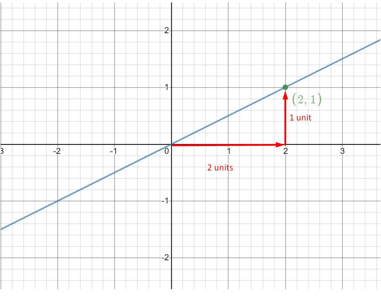 So, in order to get slope equal to one-half, we need to move 2 units along the x-axis from the origin and then 1 unit parallel to y-axis to get to the next point. The point is (2, 1).