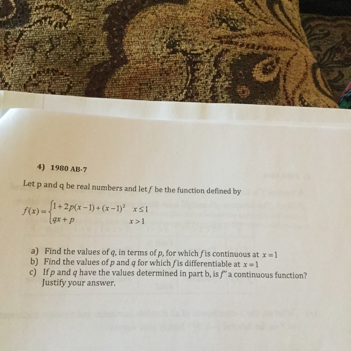 continuious means they both approach the same number as they approach 1 basically, find the vallues of q in terms of p for which both of them equal 1 so 1+2p(1-1)+(1-1)^2=1 (this simplifies to 1=1 so don't mess with the p) q(1)+p=1, q+p=1, q=1-p