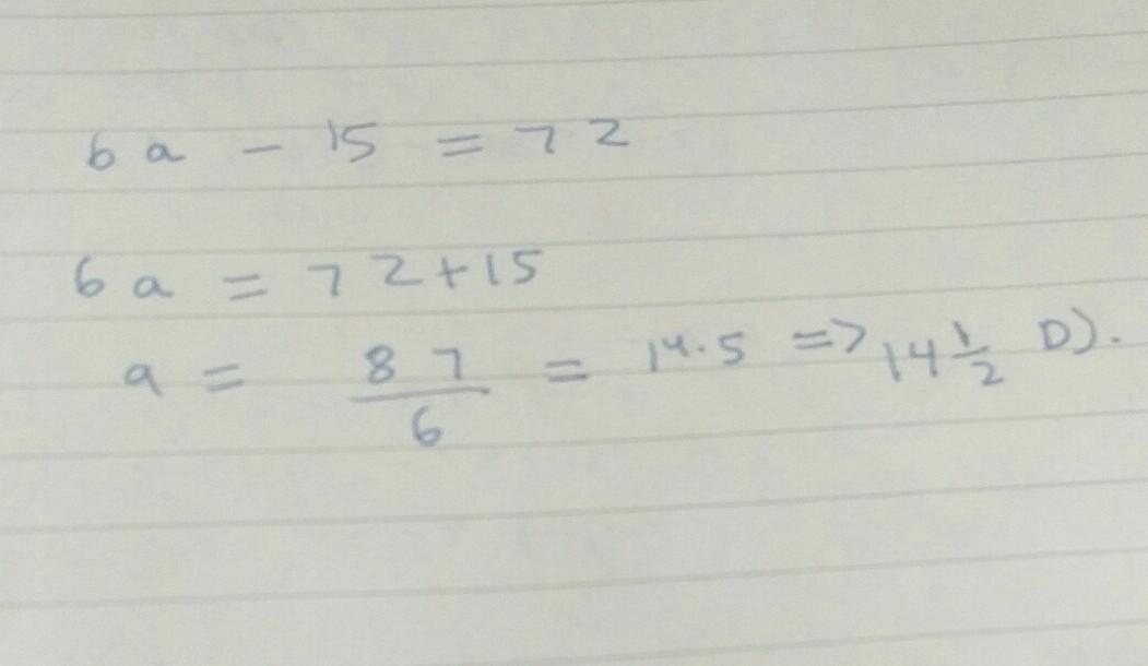 Solve for a. ба -15=72 A.27 B.12 C.9 1/2 D.14 1/2