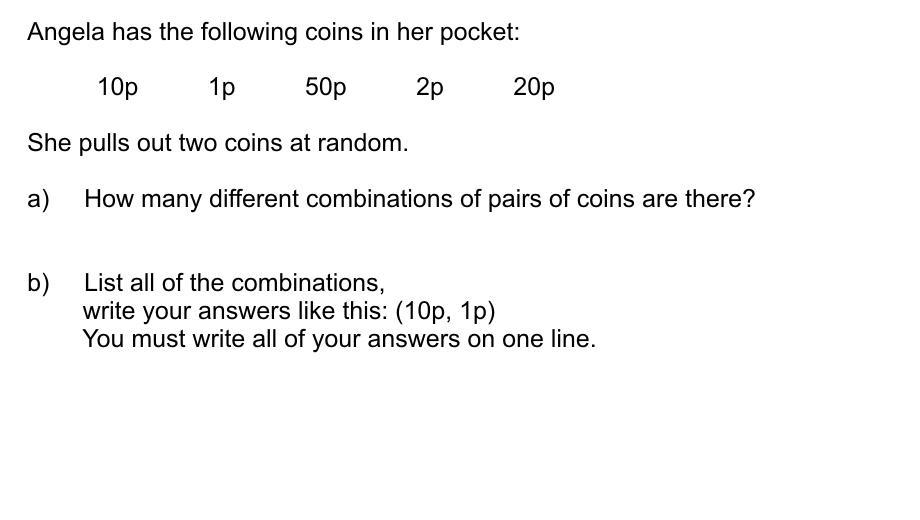b) (10p,1p), (10p,50p), (10p,2p), (10p,20p), (1p,50p), (1p,2p), (1p,20p), (50p,2p), (50p,20p), (2p,20p)