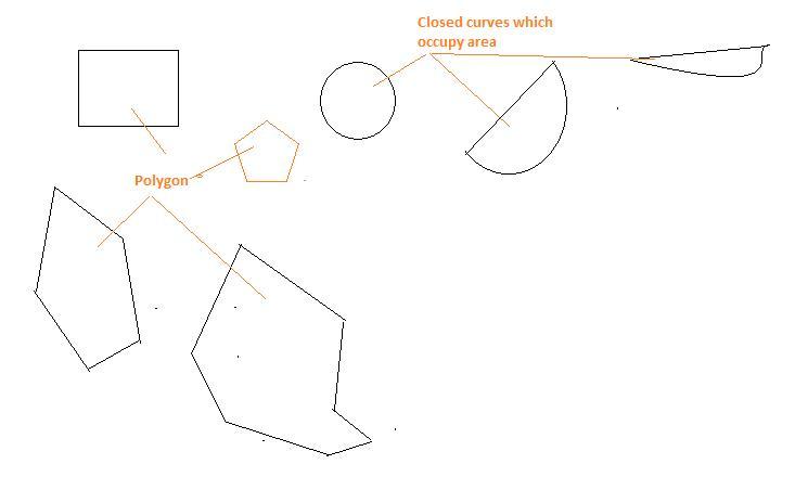 ⇒When we use the word area, it describes two dimensional closed geometrical object.It is not necessary that ,the shape is polygon only, it should be a simple closed curve.For,example, Circle, Combination of Part of curve and line segments, but it should be a closed curve.