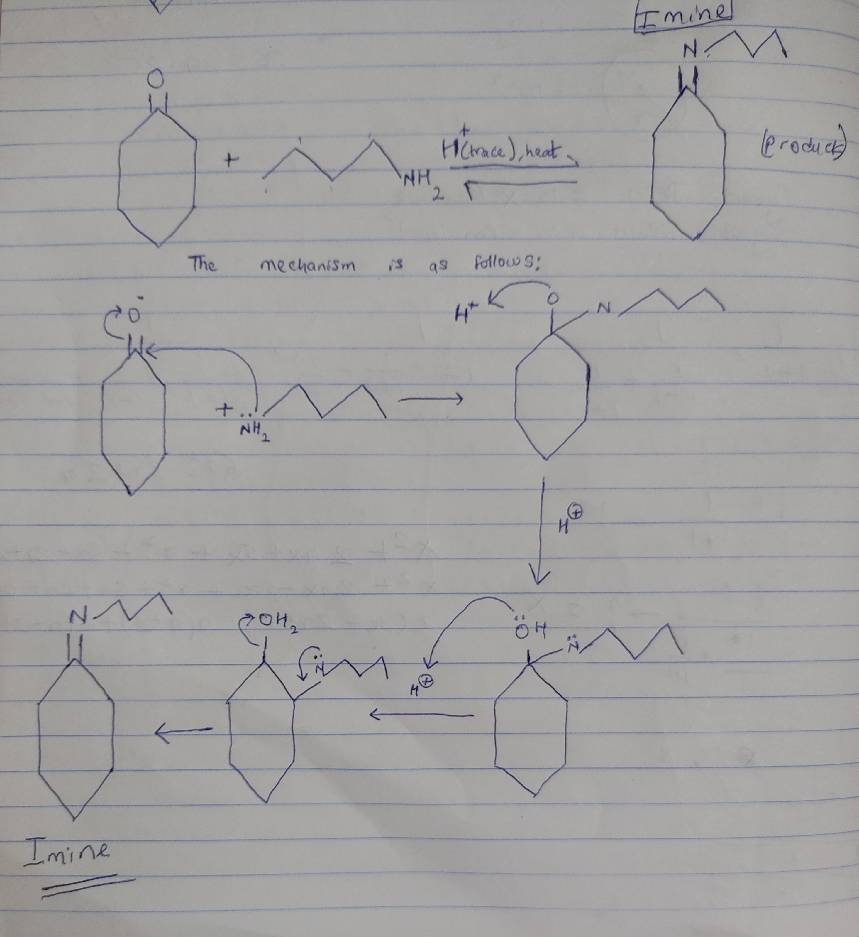 The proposed reaction is between cyclohexane and a stick structure of butylamine to yield imine as the product. The stepwise process and the mechanism carried out to get the product of this reaction is also shown in the image attached below.