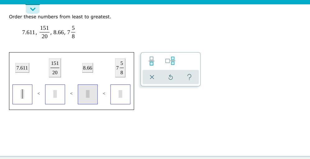 Answer: 151/20 < 7.611 < 7 5/8 < 8.66