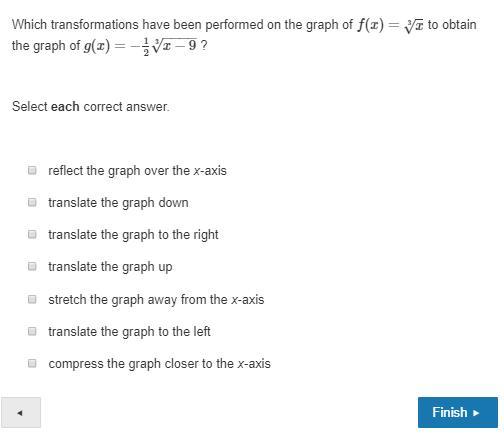 The transformed function is ![g(x)=-\frac{1}{2}\sqrt[3]{x-9}](https://tex.z-dn.net/?f=g%28x%29%3D-%5Cfrac%7B1%7D%7B2%7D%5Csqrt%5B3%5D%7Bx-9%7D)
