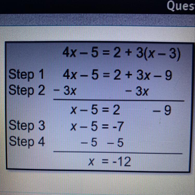 <h3>The mistake that Chelsea made was that she instead of adding 5 to both sides at step 4, she subtracted them. If she added the 5 instead of subtracting it, the answer she should've gotten was -2.</h3>