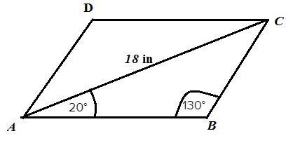 ABCD is a parallelogram. Its diagonal, AC, is 18 inches long and forms a 20° angle with the base of the parallelogram. Angle ABC is 130°