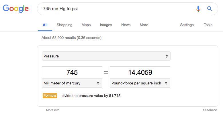 1 atm = 101,325 Pa = 760 torr (mmHg) ≈ 14.695 948 775 514 2 psi