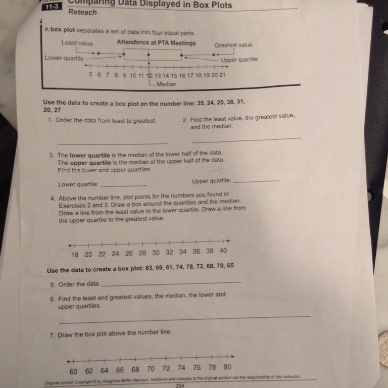 1.) 20,24,25,27,31,35,38 2.) Least value: 20 Greatest value: 38 Median: 27 3.) Lower Quartile: 24 Upper Quartile: 35 4.) Draw the first dot above 20, then a line connecting to the first line above 24, then another line above 27, then another line above the 35, then connect it to the dot that will be above 38. The lines above 24, 27,35 should make a box like the one shown at the beginning of your paper. 5.)61,63,65,68,69,70,72,74,78 6.) Least value: 61 Greatest value: 78 Median: 69 Lower quartile: 64 Upper quartile: 73 7.) Just like in number 4, plug these numbers in and create your box and whisker plot.