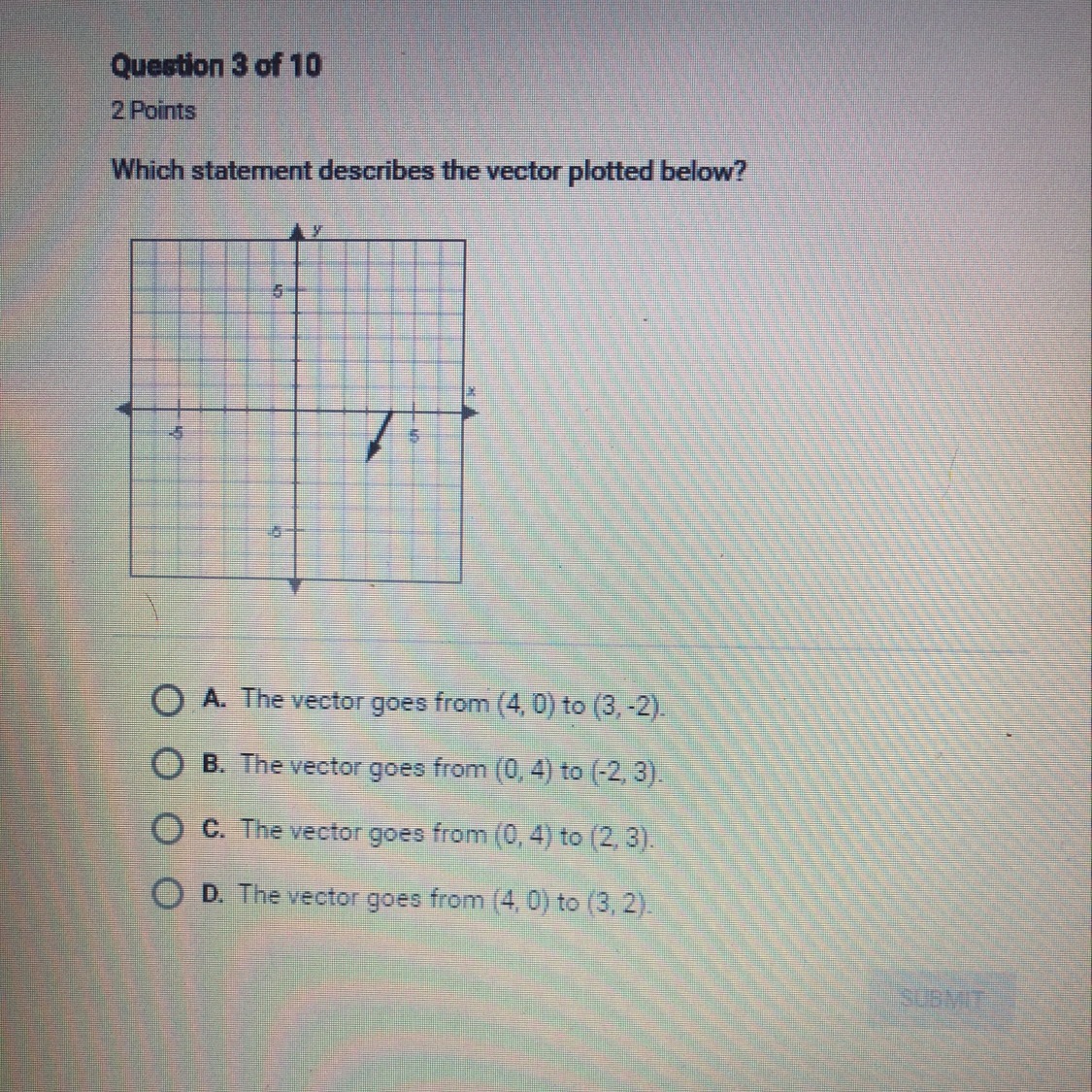 The tail of the vector is on the point (4, 0). The head of the vector is on the point (3, -2). Only answer choice A correctly identifies both of the points associated with the vector.